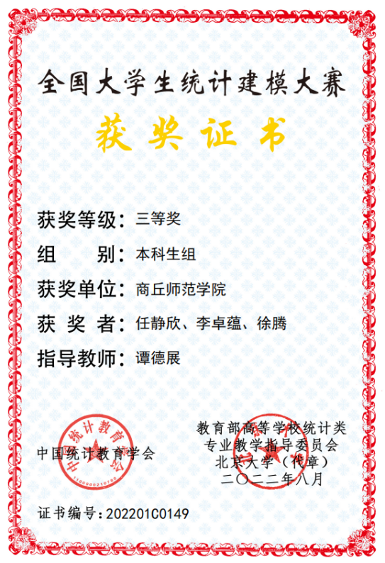 近日,中国统计教育学会公布了2022年(第八届)全国老员工统计建模大赛评选结果。本次由英国上市365郭东林老师组织负责,首次参加全国老员工统计建模大赛,取得了可喜可贺的成绩,令人鼓舞。选送的参赛论文中荣获本科组国家级三等奖2项,省级二等奖3项、省级三等奖12项。