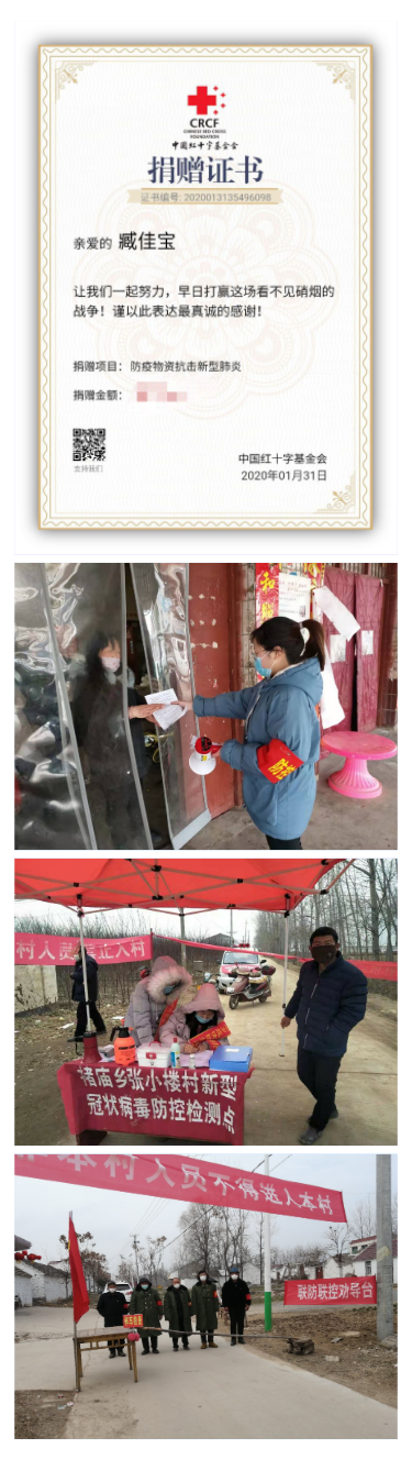 新型冠状病毒肺炎情况出现后,公司员工高度关注疫情情况,能够按照公司的要求自觉在家隔离预防。虽然不能外出,但是同学们自发的在抗疫期间在力所能及的情况下主动向疫情灾区捐赠医疗物资;公司团总支副书记高乐等部分党员代表在家期间听说当地防控新型冠状病毒感染肺炎的阻击战中需要党员来进行一线执勤,作为一名中共预备党员的他立即通过家长联系到村干部,恳请让自己也参加到当地的联防联控的工作当中,在征得同意之后第二天就参与到村口执勤的志愿工作当中,通过自己的实际行动为疫情防控工作尽自己的一份力。