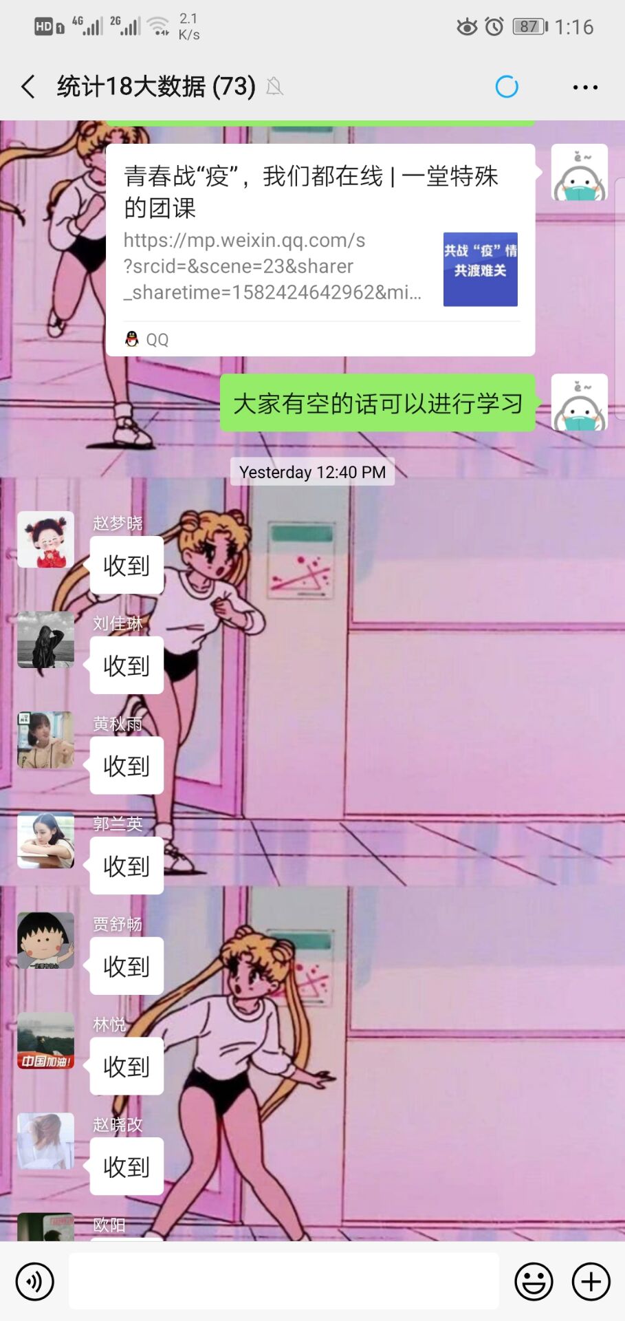 本次团课以网课的形式展开,同学们认真的学习了团课,并自觉转发朋友圈。“谣言亦是病毒,科学才是良方”,本次团课向同学们传授了有关新型冠状病毒各方面知识以及辨别谣言的方法,更呼吁同学们不信谣、不造谣、不传谣,以科学的观念、理智的心态面对疫情。团课结束后,同学们针对团课内容以及实际疫情展开积极讨论。大家纷纷表示要积极配合疫情防护工作,共同抵御新冠肺炎,自觉担负起时代赋予的责任与使命,主动担当、不负韶华。