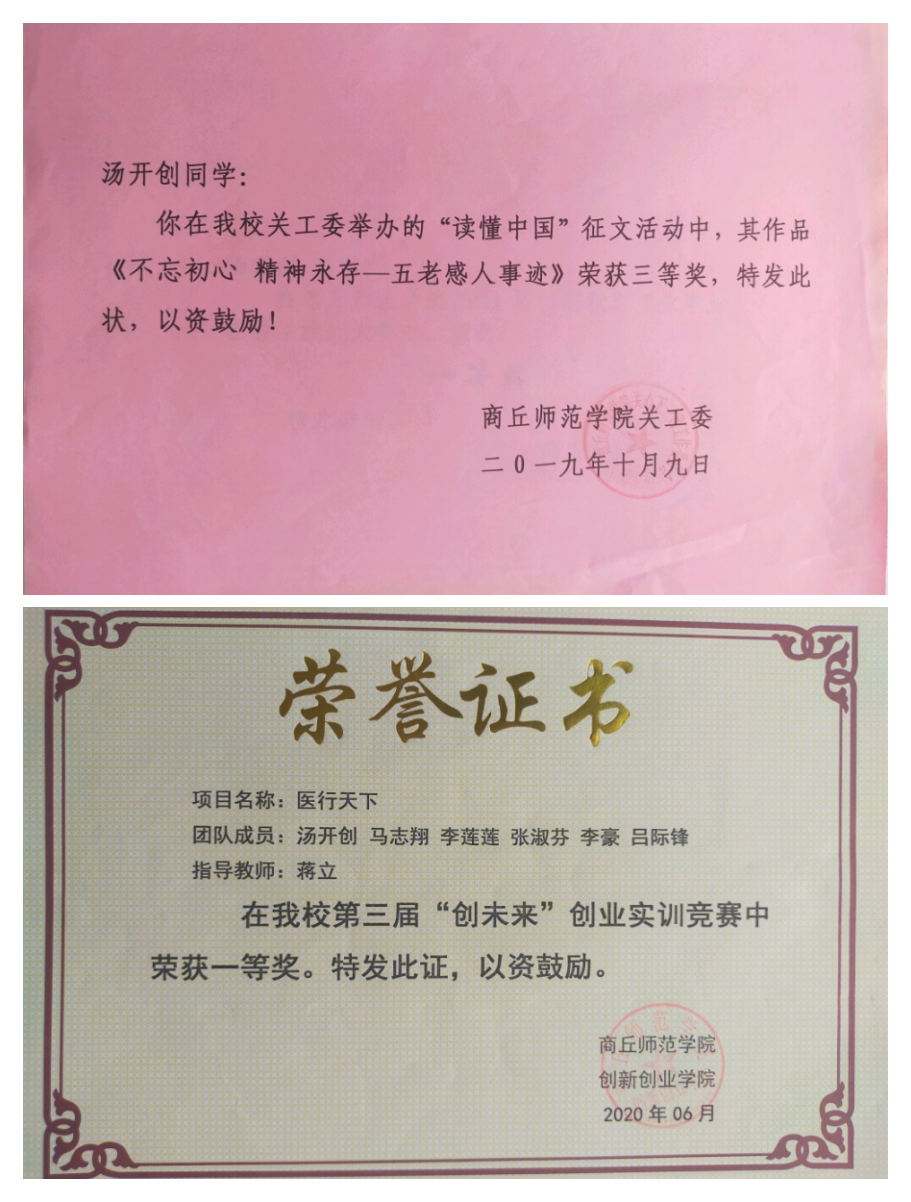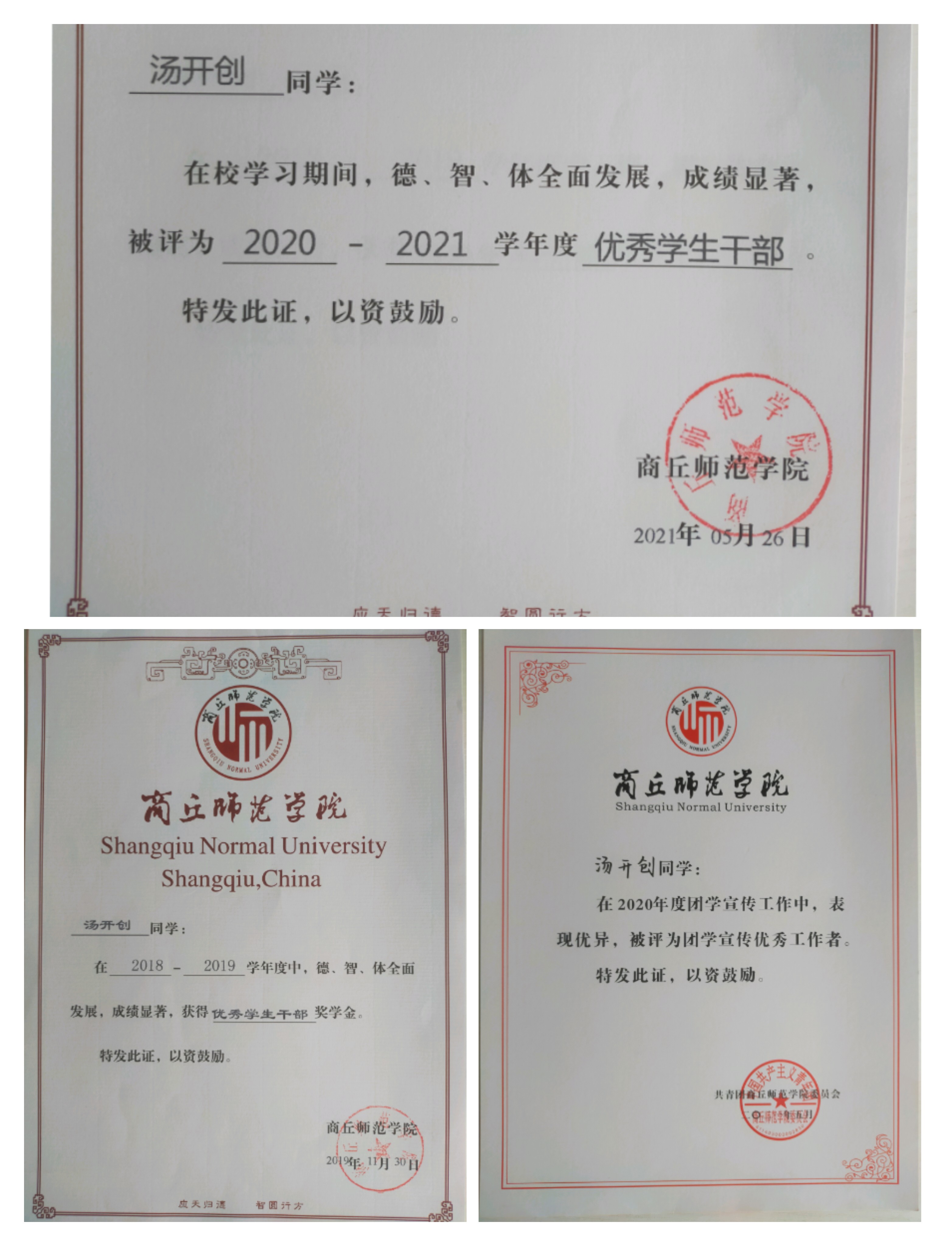 千锤万凿出深山,烈火焚烧若等闲。汤开创尊重他人,珍惜时间,不放过每一次锻炼自己的机会。大二期间他积极响应公司号召,组织带领团队参加了创新创业大赛。在备战比赛期间,他积极与团队成员进行沟通,每次团队遇到困难时他总是第一个站出来,献言献策,身体力行,在他的带动下,整个团队的成员都受到了鼓舞,勇于面对困难。就这样,在一次又一次的努力与奋斗中,他与团队成员都在慢慢的成长,最终他带领团队荣获英国上市365第三届“创未来实训比赛一等奖”。同时,汤开创还爱好写作,平时喜欢读书,提升自己的思想水平,大学期间他参加了公司关工委举办的“读懂中国”征文活动并荣获三等奖。