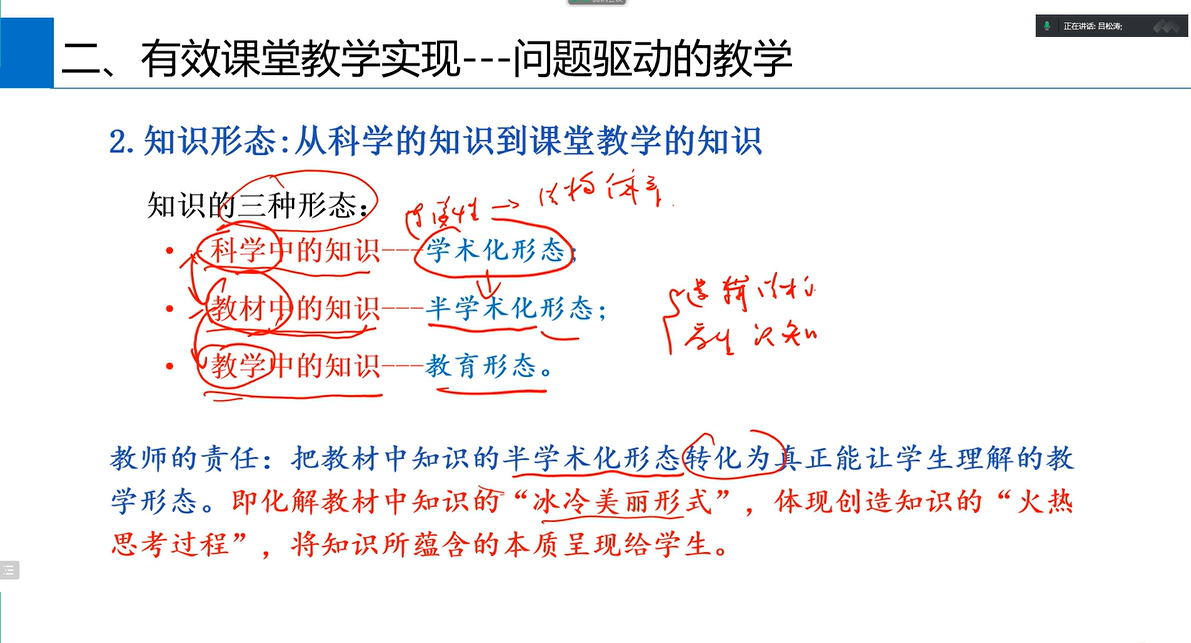 吕松涛博士围绕着“如何提升课堂教学成效”展开本次讲座,从有效课堂教学特征出发,探讨了有效课堂教学的一种实现方式,即问题驱动的教学,从教学观念、知识形态、学习方式三个方面给出了有效课堂教学的实现条件,并结合具体案例分析了问题驱动的课堂教学模式。通过案例不难发现,问题驱动教学模式对课堂教学提出了新的要求,教师不但要弄清楚教什么、怎么教,而且要明确为什么教,该教学模式不仅能提升课堂教学成效,也有助于提升教师的教研能力和自身的教学素养。