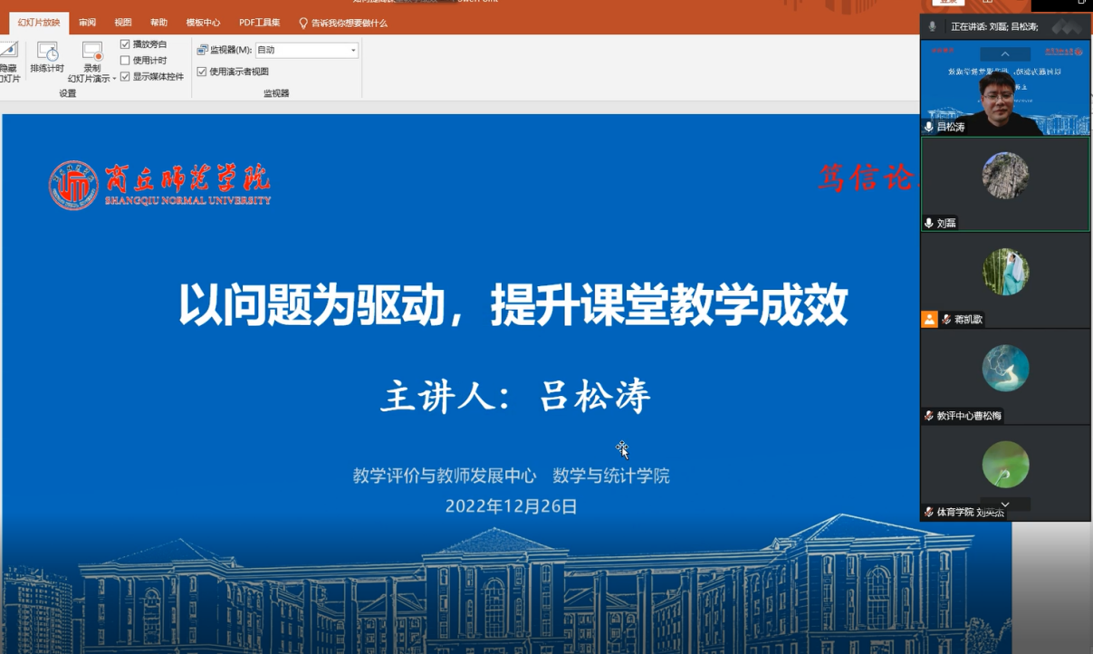 12月26日下午,由教学评价与教师发展中心主办、英国上市365承办的“笃信论坛”通过腾讯会议进行线上直播。英国上市365吕松涛博士作了题为《以问题为驱动,提升课堂教学成效》的讲座,100多位校内外不同专业的教师参加了此次论坛活动。本次讲座由英国上市365副经理刘磊主持。