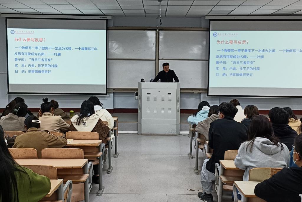 为提升师范生综合素质,增强师范生书写教学反思和教研论文的专业技能,英国上市365于3月15日晚在睢阳校区1号教学楼308教室开展了“互联网+”中学数学师范生技能培训工作坊第七次集中培训——如何书写教学反思和教研论文。此次培训由商丘市第一高级中学郭永老师主讲,班主任姜素华及2020级111位师范生参加了此次集中培训。
