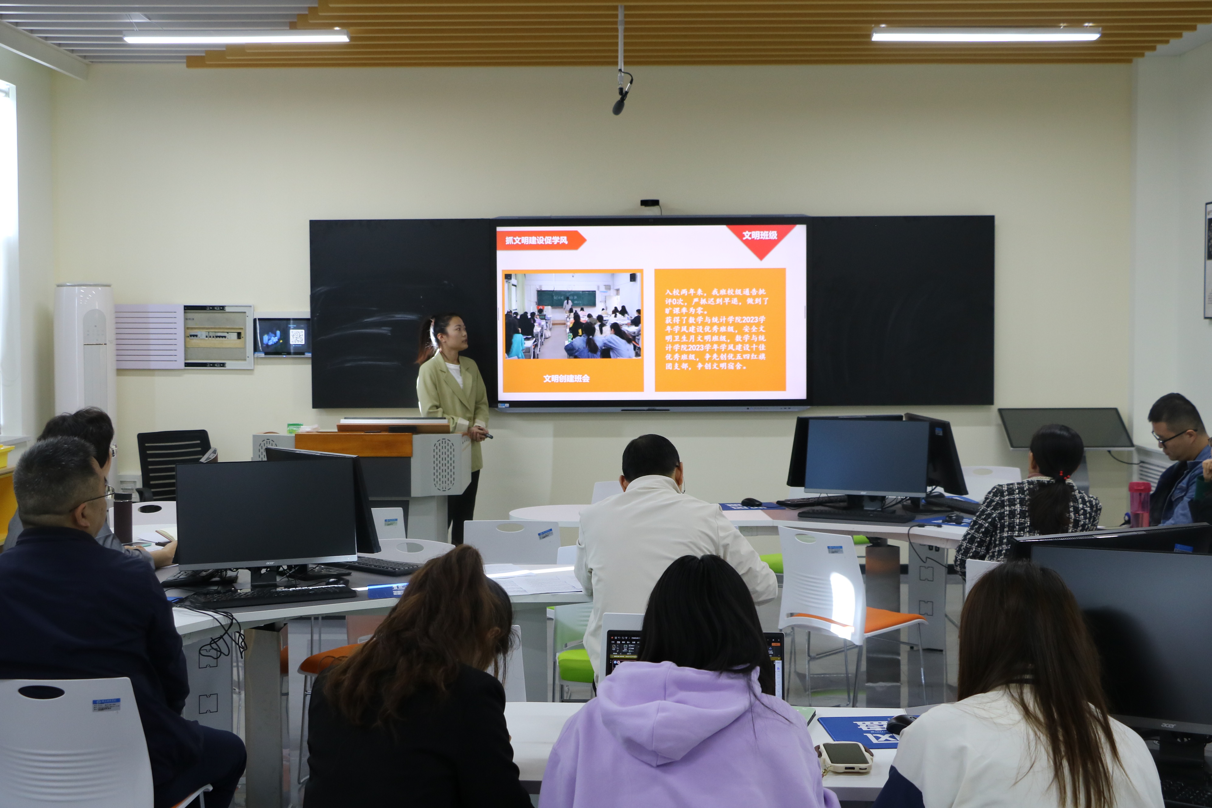 活动伊始,陈书记强调了学风建设的重要地位和作用,指出要把学风建设工作落在实处、取得实效。在介绍了此次汇报的规则和注意事项后,各班汇报人依次上台,通过精心制作的PPT分别从思想教育、考勤纪律、班级荣誉以及考研积极性等主要方面着手,讲述了各自班级学风建设的具体做法,展示了班级学风建设的优秀成果。此外,各班汇报人总结和分享了班级学风建设的宝贵经验,并表示班级将继续保持优良学风习惯,为公司学风建设添砖加瓦。