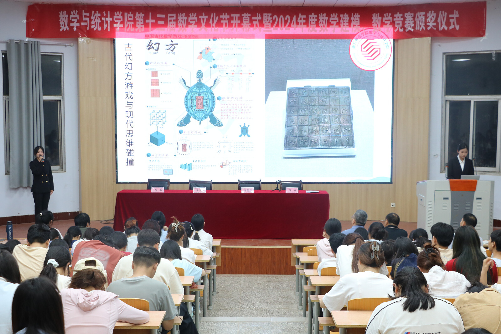 本次活动包括开幕式和颁奖仪式两个环节。开幕式上,党委书记孟学超致开幕词。孟书记介绍了本次数学文化节的目的和意义,希望同学们能够厚植文化底蕴、培养科学思维、践行创新精神,积极参与到各项活动中。学习部吴雨清同学带领大家回顾了往届数学文化节各项活动,并介绍了本届数学文化节的主要内容。此次数学文化节设置了数学谜题竞答、数学建模展示等丰富多样的活动,旨在让同学们在趣味游戏中感受数学魅力。