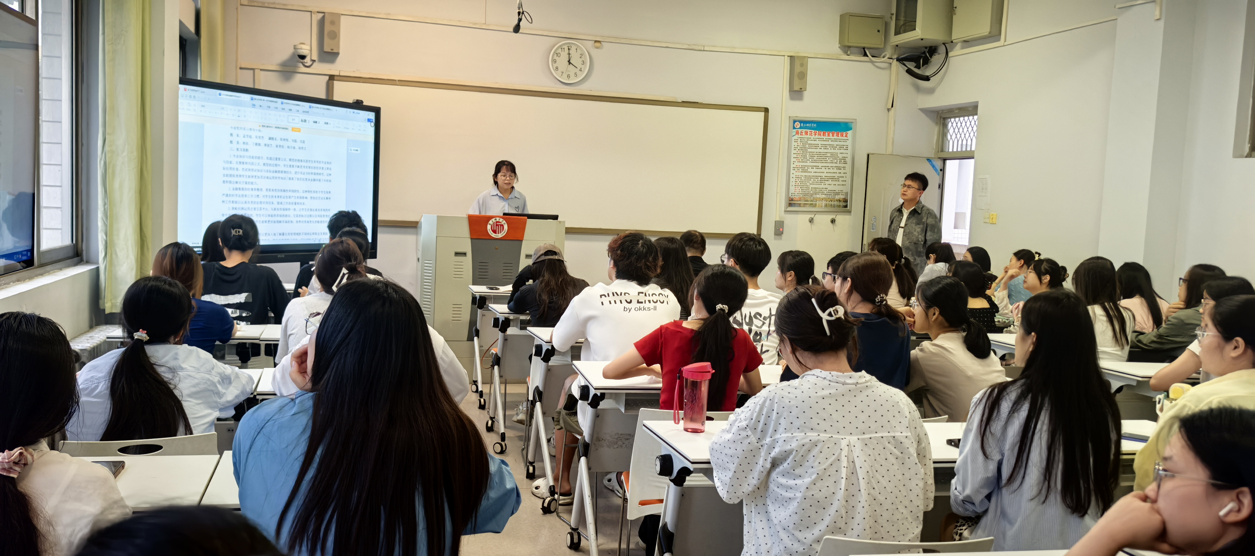 金融数学专业实习负责人丁娜娜老师首先解读了金融数学专业实习方案,介绍了不同阶段的实习任务和要求。接下来,刘磊做了实习动员讲话。他向同学们介绍了公司金融数学专业的专业发展与办学理念,鼓励大家积极、认真、主动地参与到实习的各个环节中去。同时强调了实习纪律、注意事项和实习安全等问题。最后,孙寿文宣读了专业实习的分组并组织了各小组员工与实习指导老师的见面会。