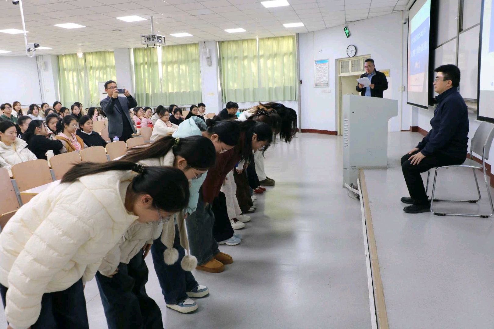 第二环节是庄严隆重的拜师仪式,主持人宣读结对的师生组合,老师在讲台上接受员工的拜师礼,一鞠躬“师道之要,修身立德”、二鞠躬“传道授业,释疑解惑”、三鞠躬“铭记恩师,天地可鉴”。拜师仪式结束后师徒进行互动,互相留取联系方式并合影留念。