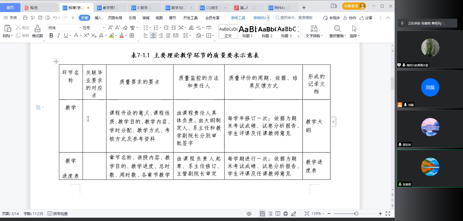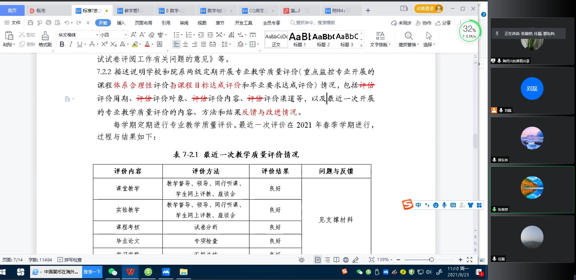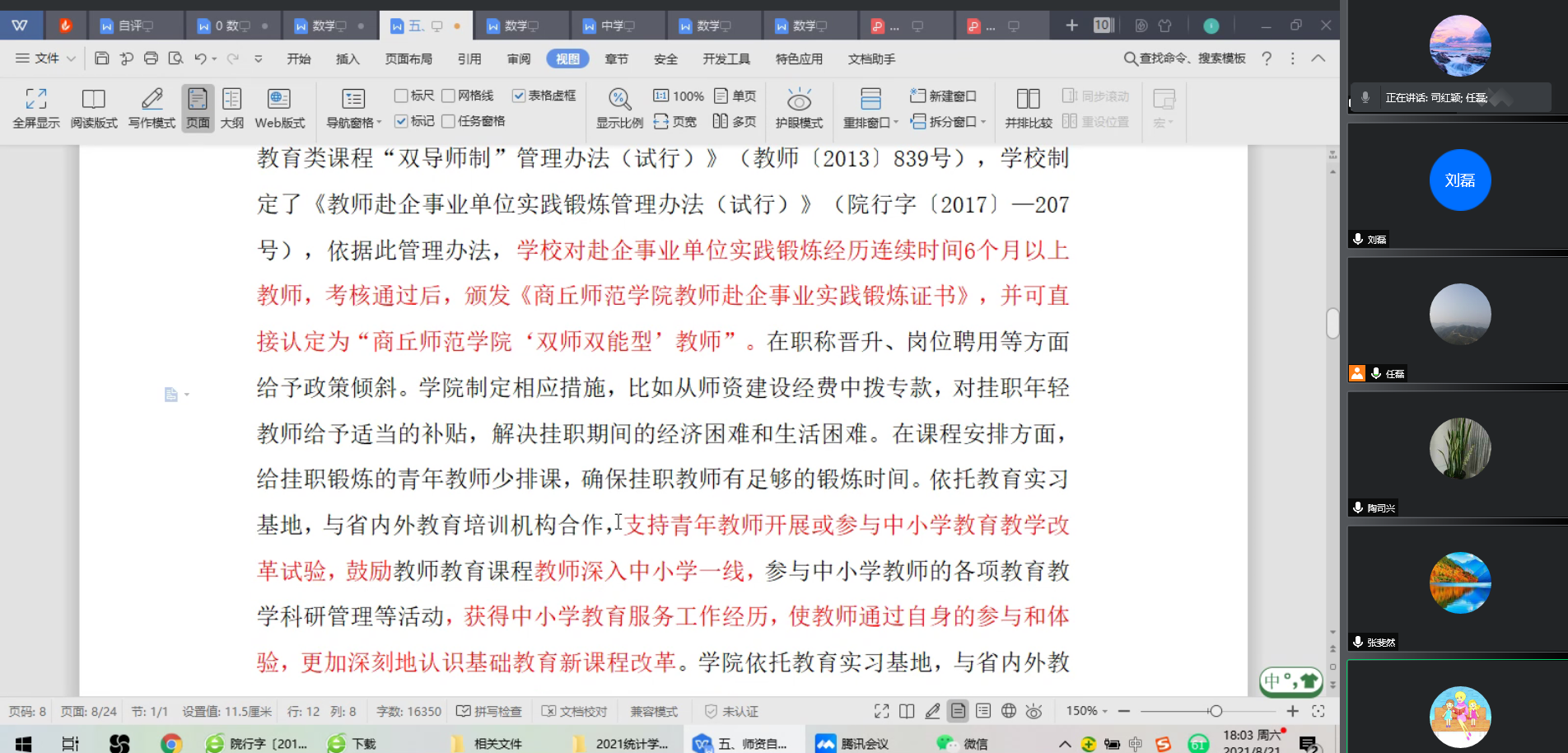 扎实推进“数学与应用数学”师范专业认证工作,做好认证自评和认证准备,8月18日至24日,英国上市365经理张斐然、副经理刘磊、各教研室主任、撰写小组成员、材料组成员借助腾讯会议线上持续进行了师范专业认证自评报告的审核、修改工作。