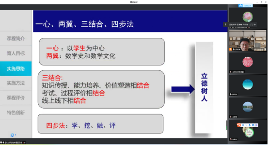 首先,郭志林老师分享了《高等数学》校级思政教学团队建设中的宝贵经验,并结合思政样板课程《高等数学》,从教学方式、教学载体、教学途径等方面,介绍了如何将高等数学中的思想政治教育元素和所承载的思想政治教育功能融入课堂教学各环节、实现思想政治教育与知识体系教育的有机统一的方法。其次,史玉英老师结合思政样板课程《数学分析》中的教学经验,从课程思政的育人目标、实施思路和实施方法等方面谈了如何在教学中“春风化雨、润物无声”融入课程思政的方法。
