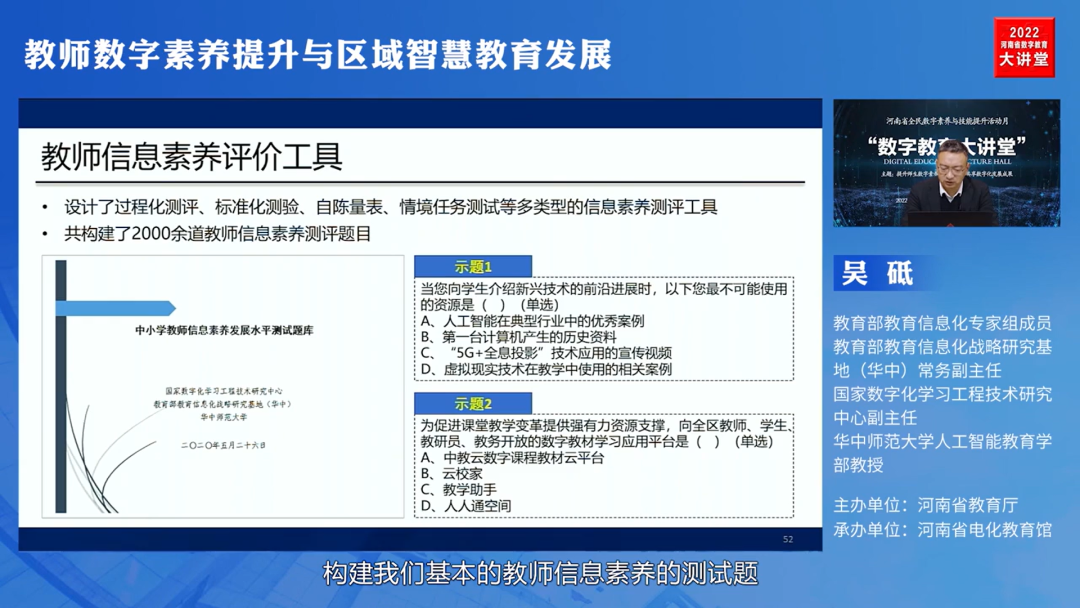 讲座分“教师数字素养提升与区域智慧教育发展”、“数字时代的教育安全形势”、“人工智能赋能教育变革与教师发展”三大板块进行。授课过程中,胡小勇教授强调,数字化转型、智能化升级是当前国家教育改革创新的重要方向,在此背景下,人工智能将为教育高质量发展带来新契机,为教师的智能教育素养带来机遇与挑战。