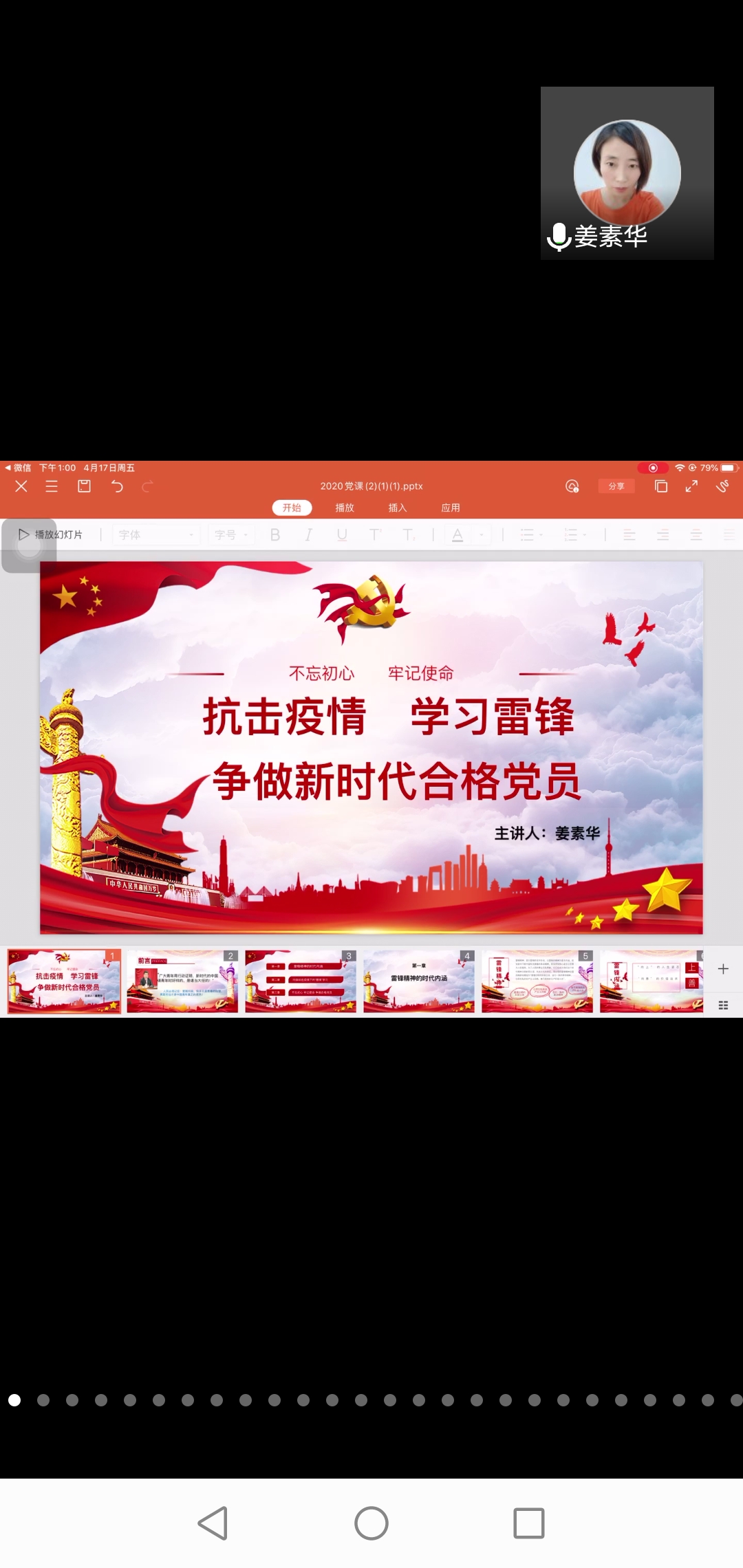 党课开始,姜素华书记详细讲述了“雷锋精神的时代内涵”,雷锋精神实质和核心是全心全意为人民服务,既要有“向上”的人生姿态,又要有“向善”的价值追求。接着,针对此次疫情,姜素华书记指出要向奋战在疫情下的“雷锋”学习,用“渐冻”之身“保卫武汉”的张定宇等,他们奉献自己,守护每个人的健康和生命安全,真正做到了“不忘初心、牢记使命”。最后姜素华书记还指出,大家要坚定理想,做牢记信念和宗旨的表率;脚踏实地,做勤于学习的表率;勇做奋进者,严格要求自己,争取早日成为党组织的一员,在各自的生活工作中充分发挥党员的先锋模范作用,争做合格党员,永远跟党走!