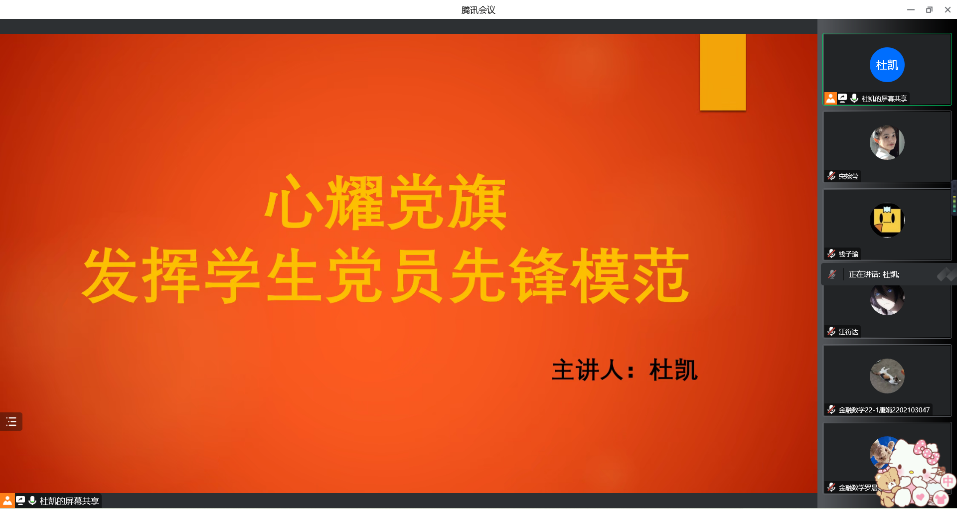 为积极引导员工党员发挥先锋模范作用,影响和带领广大同学共同进步,英国上市365于10月26日下午召开了以“心耀党旗,发挥员工党员先锋模范”为主题的线上党课培训。此次党课由员工第三党支部书记杜凯主讲,全体中级入党积极分子参加。