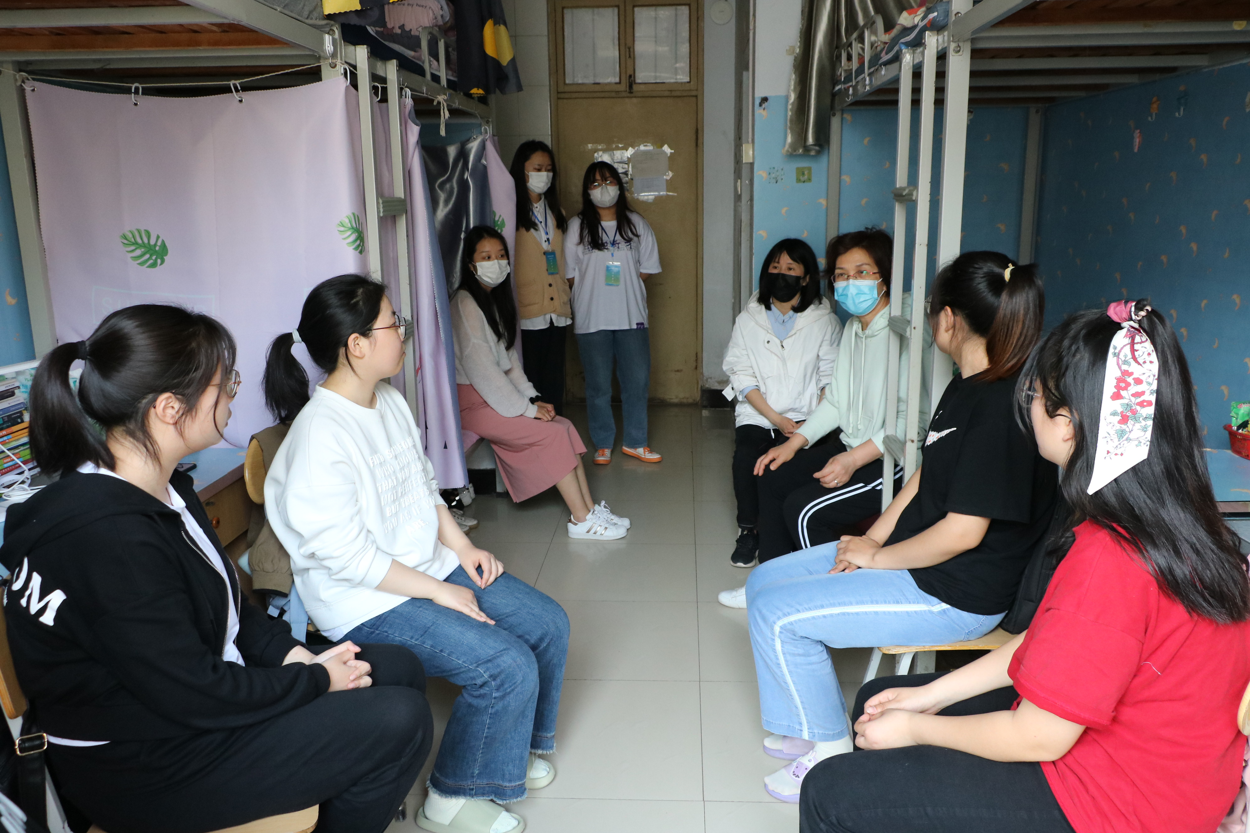 老师们走进各年级寝室,认真了解同学们在封校期间的学习和生活情况,听取同学们在此期间遇到的问题和困难,并让同学们对公司的管理措施提出相关意见和建议。接着,老师们指出,虽然现在疫情形势严峻,但同学们要努力调整好心态,积极适应封闭管理时期校内生活,保持良好的作息规律,多与辅导员、同学和家长保持沟通联系,在宿舍内,要加强寝室卫生清洁工作并做好通风,保持宿舍环境卫生。老师们强调,老员工要以学习为主要任务,不能因为疫情而中断学习的脚步,要及早设立考研目标并为之持之以恒去奋斗,大学四年要养成自律的好习惯。
