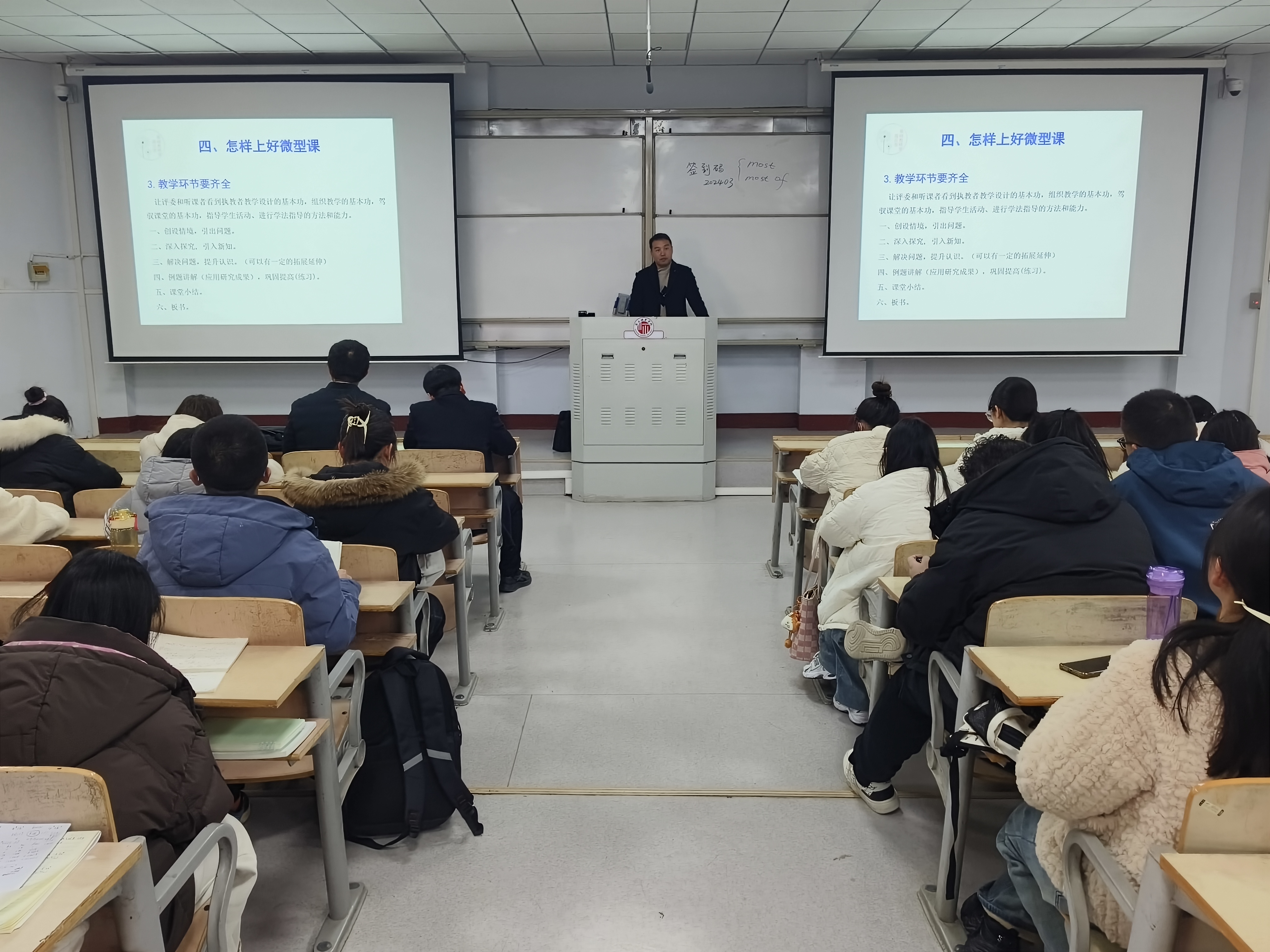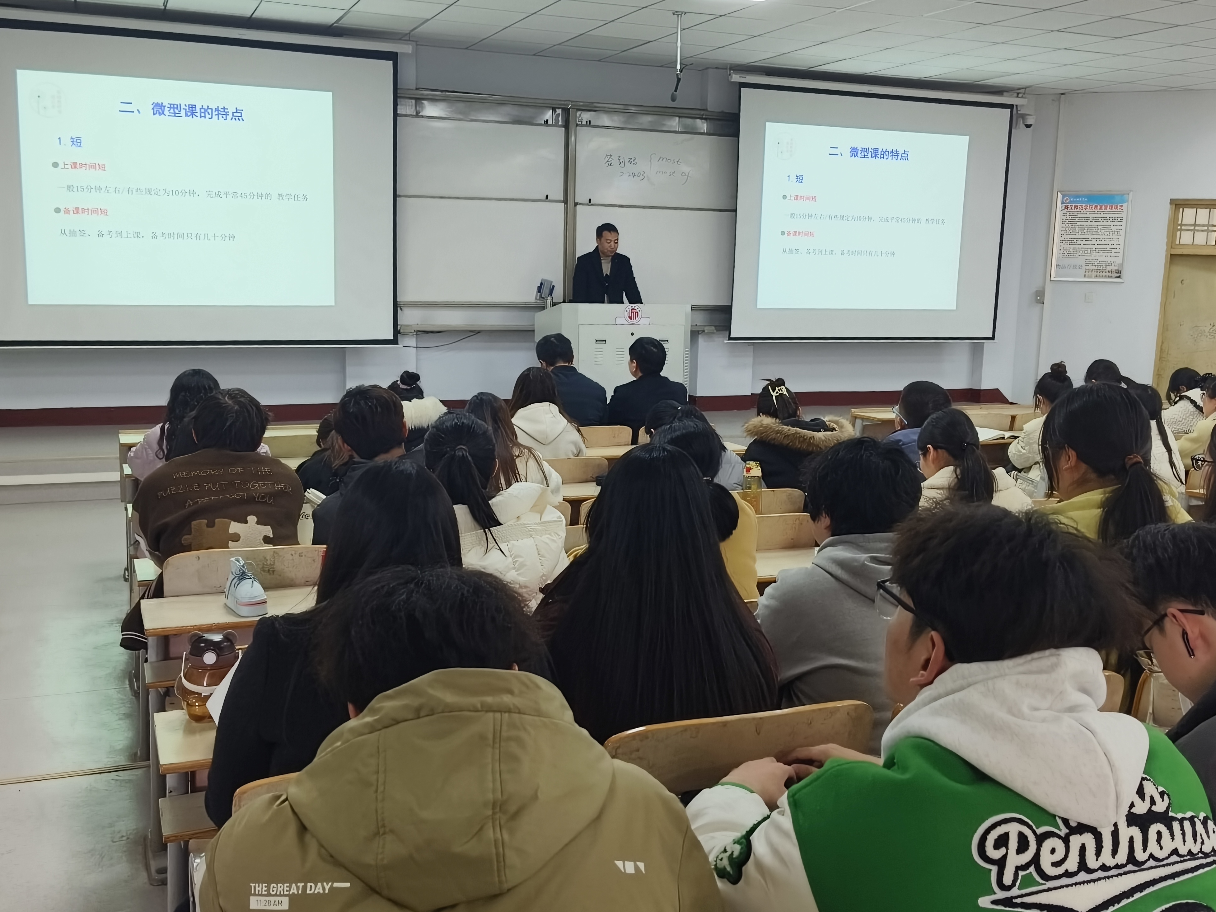 本次培训围绕微型课的定义、特点、用途及教学技巧等七个方面展开。培训开始,范兴达从微型课的“四精”原则入手,详细解读了其核心要求,并用“短、小、精、巧”四个字精准概括了微型课的特点,生动展示了微型课在实际教学中的应用及其重要性。接着,范兴达深入阐述了上好微型课的七个关键方面,强调“教学环节要齐全”和“课堂板书要简约”这两个重要原则。并通过“再探菱形”的案例,详细讲解了微型课与微课之间的主要区别,帮助同学们更加清晰地理解两者的不同。最后,范老师结合自身的教学经验,深入浅出地讲解如何讲好一节微型课的教学方法,让同学们受益匪浅,收获满满。
