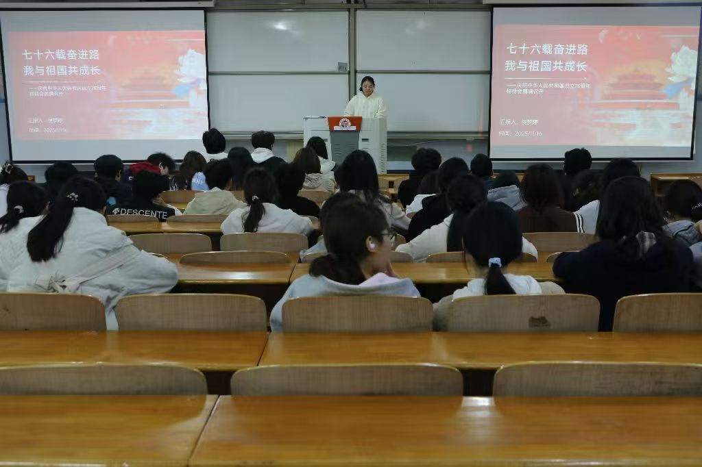学习会上,侯梦婷以新中国76年壮丽征程为主线,分四个篇章带领全体成员循着历史脉络展开学习。她从开国大典的庄严时刻讲起,沿着国家发展的足迹,一路延伸至新时代民族复兴的加速推进;随后介绍了我国经济总量跃居世界第二的历史性跨越,并系统梳理了精神谱系的传承与发展。最后,她结合青年一代的使命担当,号召同学们将个人理想融入国家发展大局,以创新与实践为强国建设注入青春力量。参与同学反响热烈,纷纷表示将以实际行动接过时代的接力棒,努力在青春赛道上跑出当代青年的最佳成绩。