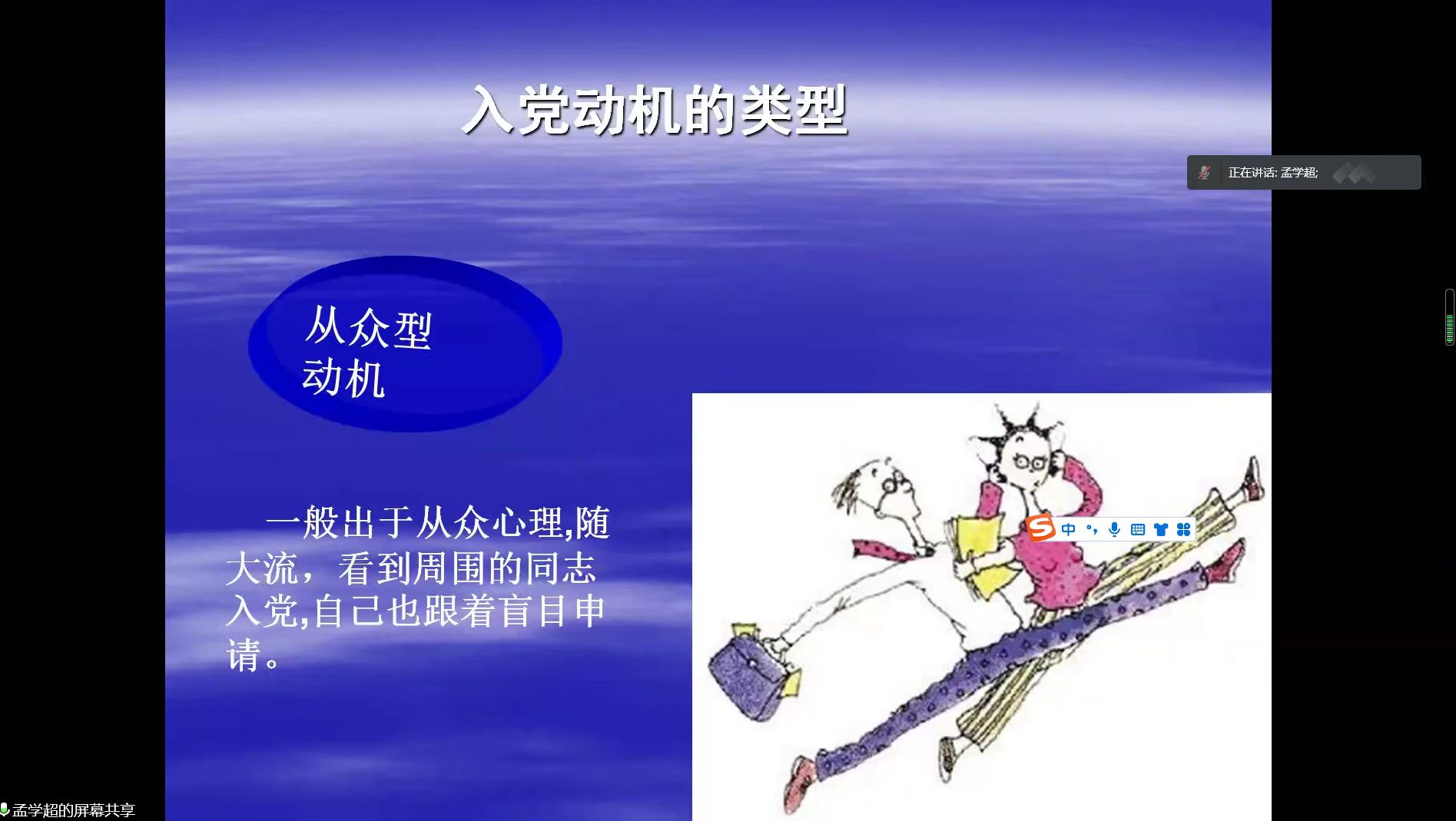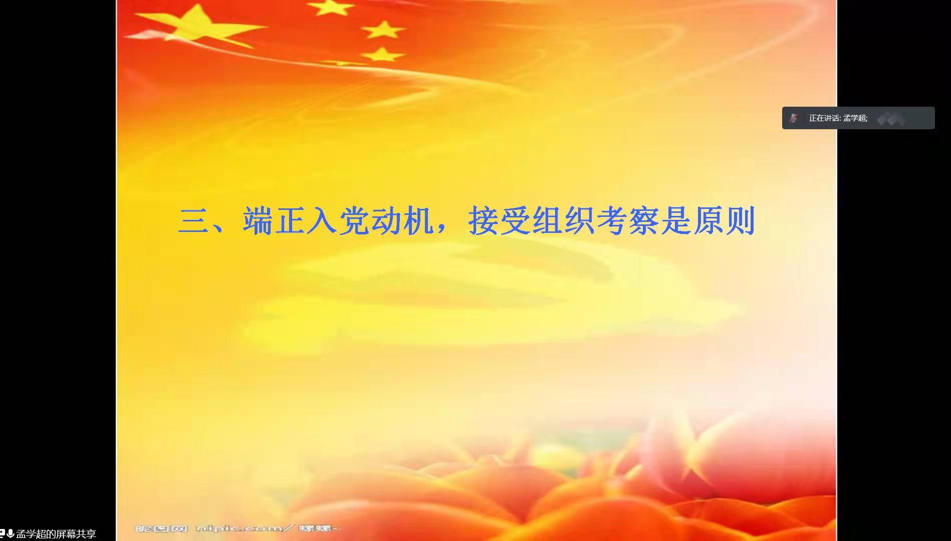 为端正入党积极分子的入党动机,英国上市365于3月28日晚线上召开了以“端正入党动机,争取早日加入党组织”为主题的中级入党积极分子党课培训会议。本次党课由党委书记孟学超主讲,全体中级入党积极分子参加。