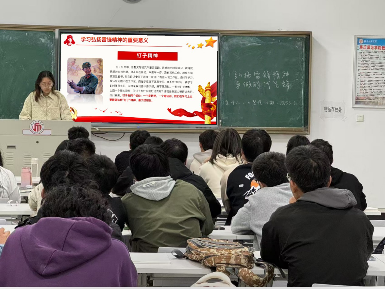 2025年3月11日晚上7点,数学与应用数学2024级3班团支部在梁园校区行方楼429教室组织开展了“弘扬雷锋精神,争做时代先锋”主题团日活动。活动伊始,张涵涵同学通过播放雷锋事迹纪录片,带领大家走进雷锋平凡而伟大的一生。观影结束后的交流分享环节中,同学们结合自身经历踊跃发言,畅谈对雷锋精神的理解与感悟。最后,张涵涵同学鼓励大家在今后的学习和生活中多参加志愿服务,切实践行雷锋精神。