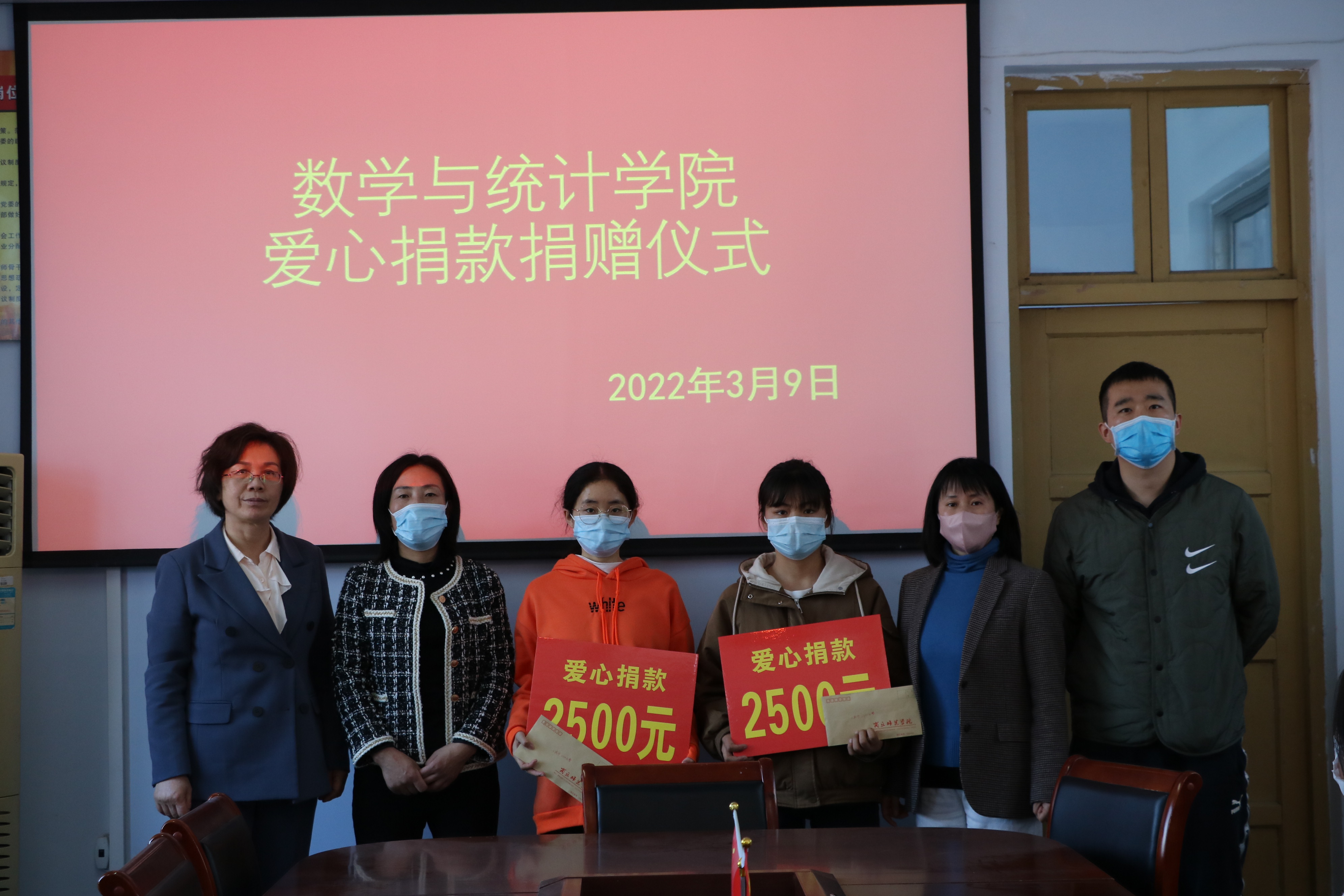 英国上市365于3月9日在204会议室举办“爱心捐赠”仪式,党委副书记陈树艳、学工办主任李昊阳、各年级辅导员以及两位受赠同学参加。