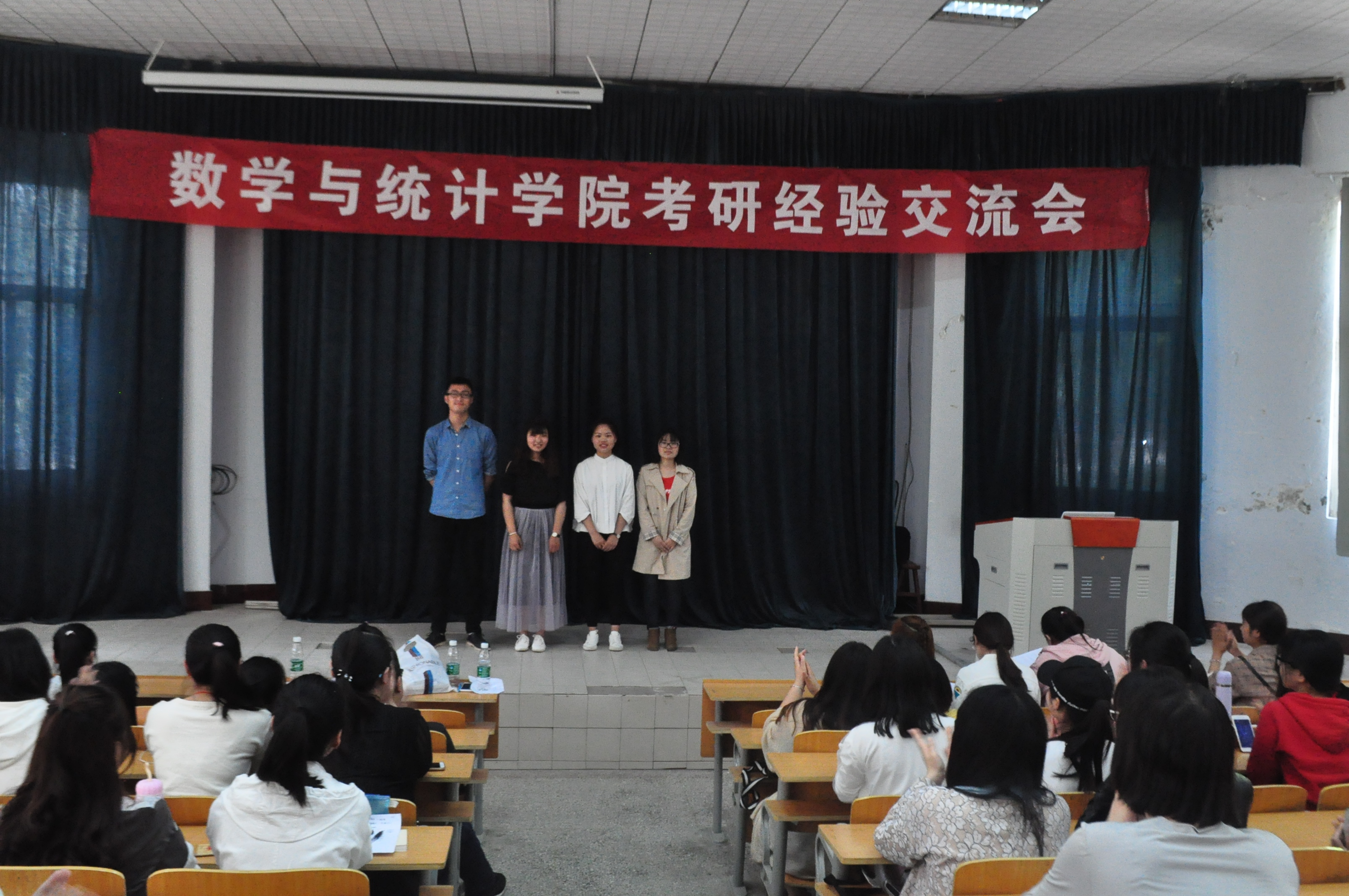 然后,学长学姐给同学们分享了考研心得和经验。14级应用数学专业的唐艳艳同学讲述了自己的考研之路,特别提到了考研艰辛历程中遇到的朋友,谓之“研友”,给她以很大的精神鼓励。学长学姐告诫同学们一定要坚定初心,既然选择了考研,就要老老实实地学习。并对复习给出了建议:以专业课为主,大面积撒网。他们还提到,考研是一场硬仗,要注意劳逸结合,适当加强营养和锻炼。