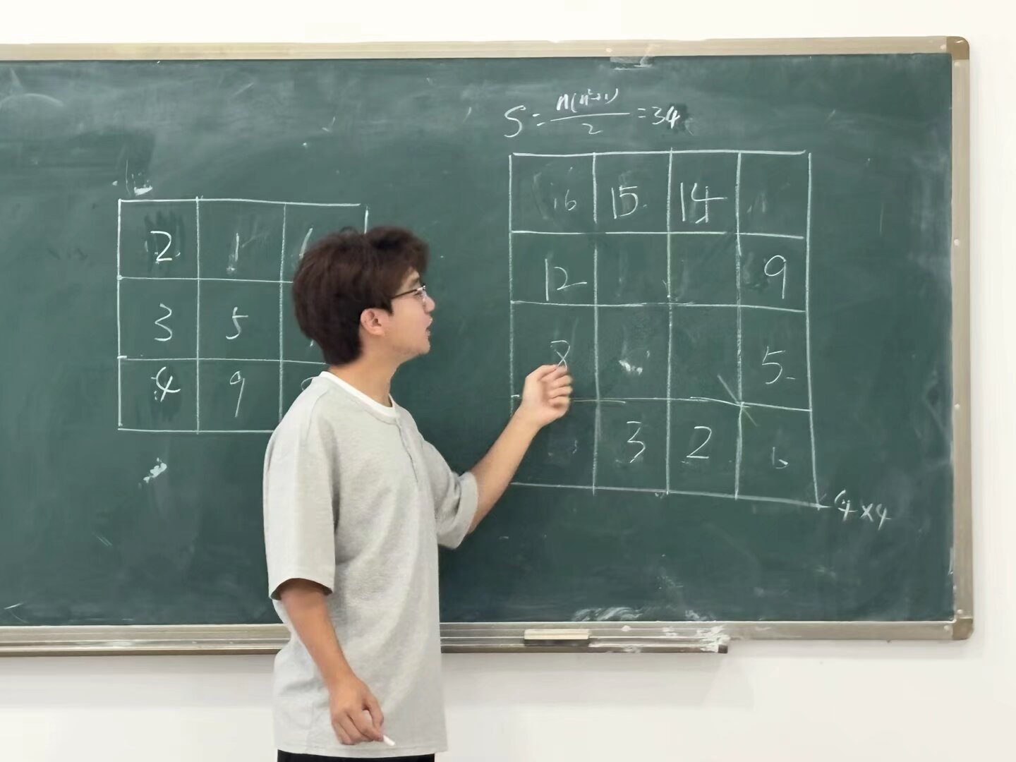 活动伊始,李佳骏同学详细介绍了幻方的历史与原理。随后,同学们积极参与“拼3阶幻方”分组挑战,在数字排列与逻辑推理中感受数学之美,提升团队协作与思维能力。在幻方与现代密码学的挑战区,同学们深入剖析幻方与现代密码学的紧密联系,通过思考加密算法中矩阵变换与幻方数字排列规律的相似性,领会数学跨学科应用的魅力;在幻方挑战区,大家专注地摆弄着数字卡片,尝试拼出3阶幻方,眼神中满是对解开谜题的渴望;在密码学体验区里,同学们相互交换密文认真破解,感受到数学知识与实际应用交融所迸发的独特魅力。