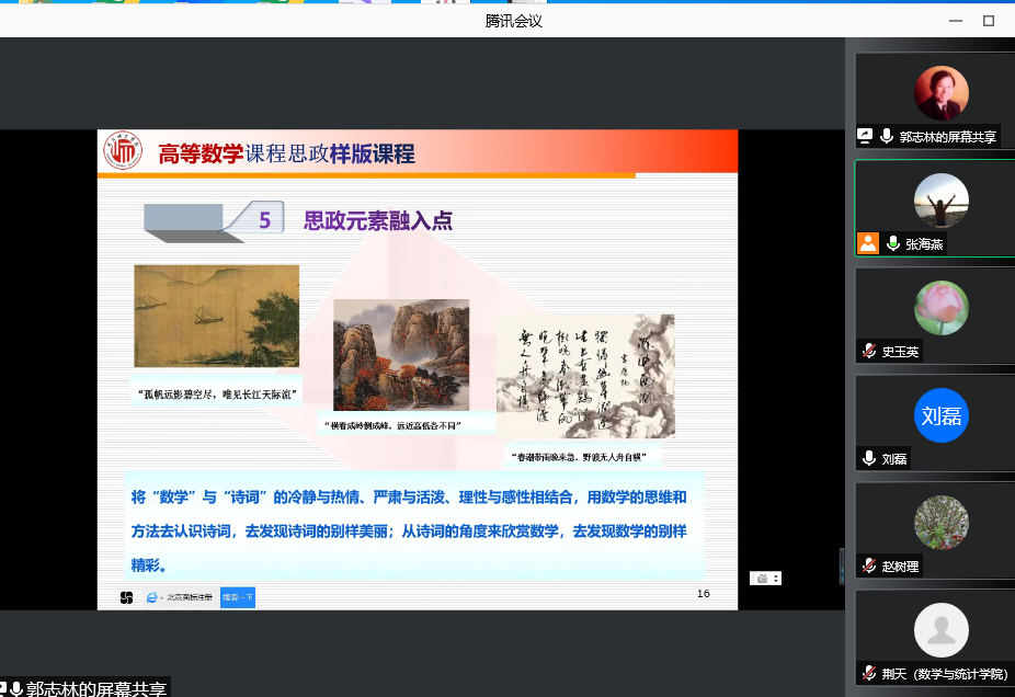 会上,由获得此次校级样板课程的课程负责人郭志林教授和孙菊香博士为大家分享课程思政建设的经验。郭志林教授主要从《高等数学》课程思政建设的指导思想、教学设计的思路、育人目标和思政元素的融入点等方面,进行了详细介绍,郭志林教授还重点强调了将思政元素与学科知识讲授恰当融入的重要性,要注意教学方式方法要灵活,不能生搬硬套。孙菊香博士为大家介绍了《高等代数》课程思政建设的理念和思路,从数学家故事、数学发展史、数学概念和思想等方面充分挖掘思政素材,将政治认同、国家意识、文化自信、公民人格等思想融入课程教学中。通过两位老师的精彩报告,大家对如何课程思政有了更进一步的认识,同时也激发了大家对课程思政建设的热情。随后,系全体教师对思政资源探索与思政元素的有机结合、思政元素的有效融入课堂教学等方面进行了热烈的讨论。