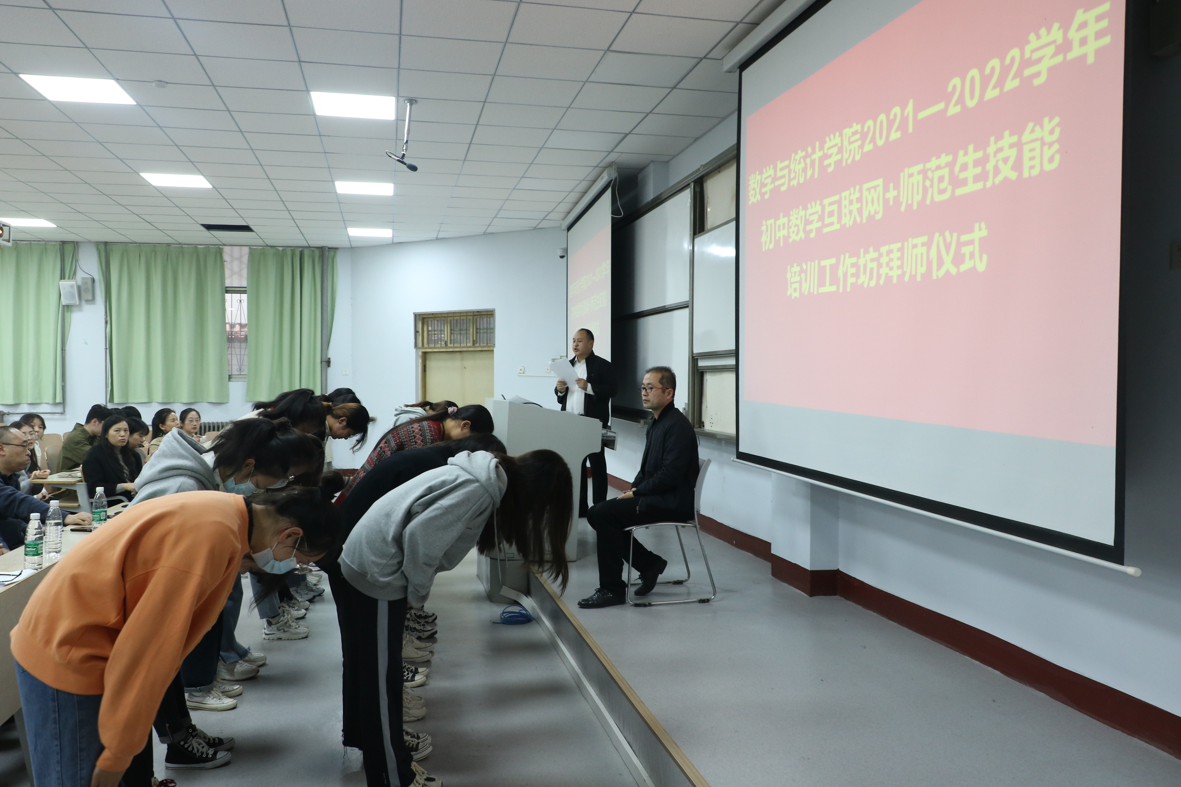 工作坊启动仪式共有师生见面会、拜师仪式和指导老师讲话三个环节。师生见面会以一线名师介绍和师生互动的方式进行,会上刘磊对精心遴选的10位工作坊坊主逐一做了详细介绍,随后坊主和所带的110名数学与应用数学专业员工进行了充分的交流。